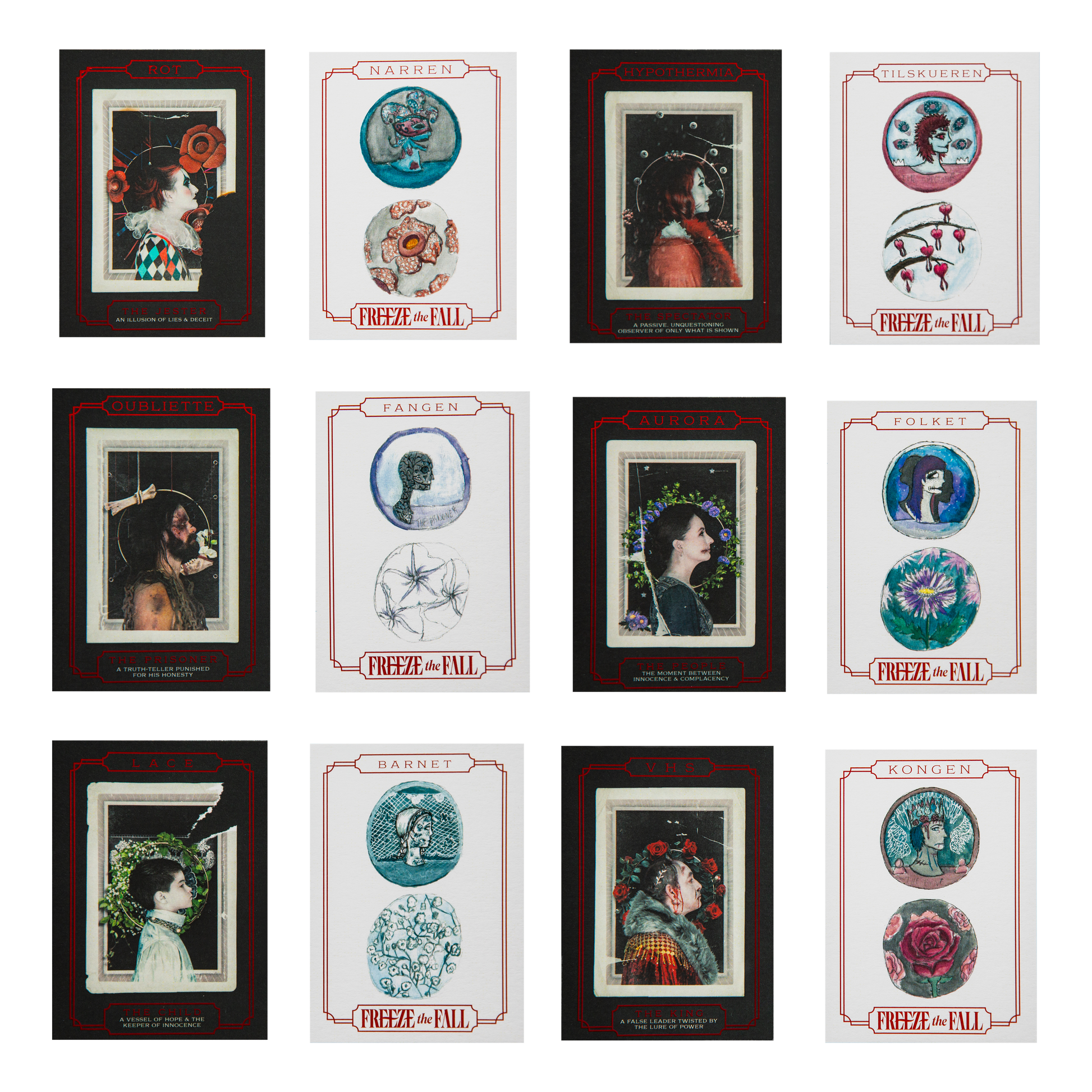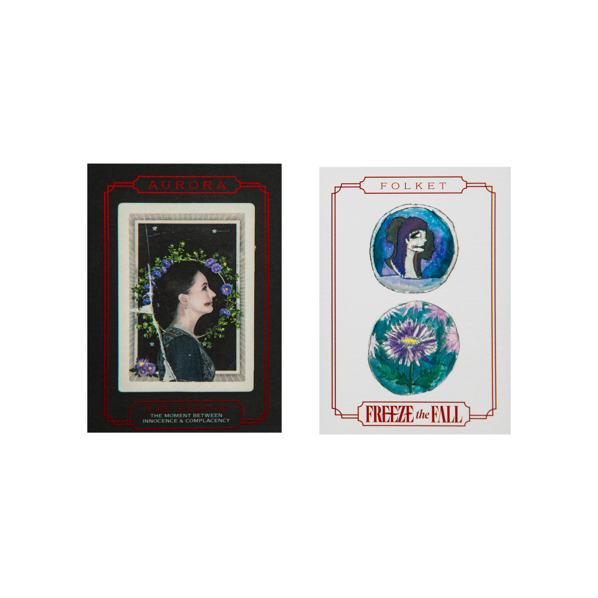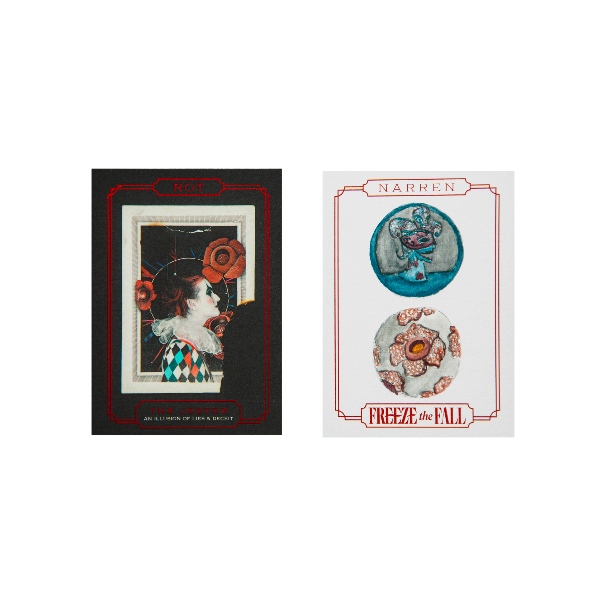 These 2.5x3.5 trading cards feature all 6 of the characters of The Red Garden. The fronts are accented by a striking red foil, with the back sides showing the original character and flower art work that inspired the imagery featured in the album. The cards are encased in protective plastic sleeves.